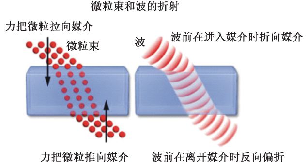 图3 光折射现象的微粒理论和波动理论的解释示意图