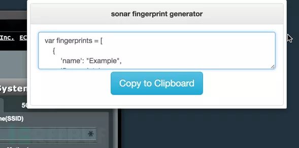 现在我们的目标路由器有一个漏洞——那么我们如何将它集成到sonar.js中呢?首先,我们需要创建一个sonar.js指纹,下面的代码片段显示了这种指纹的格式: