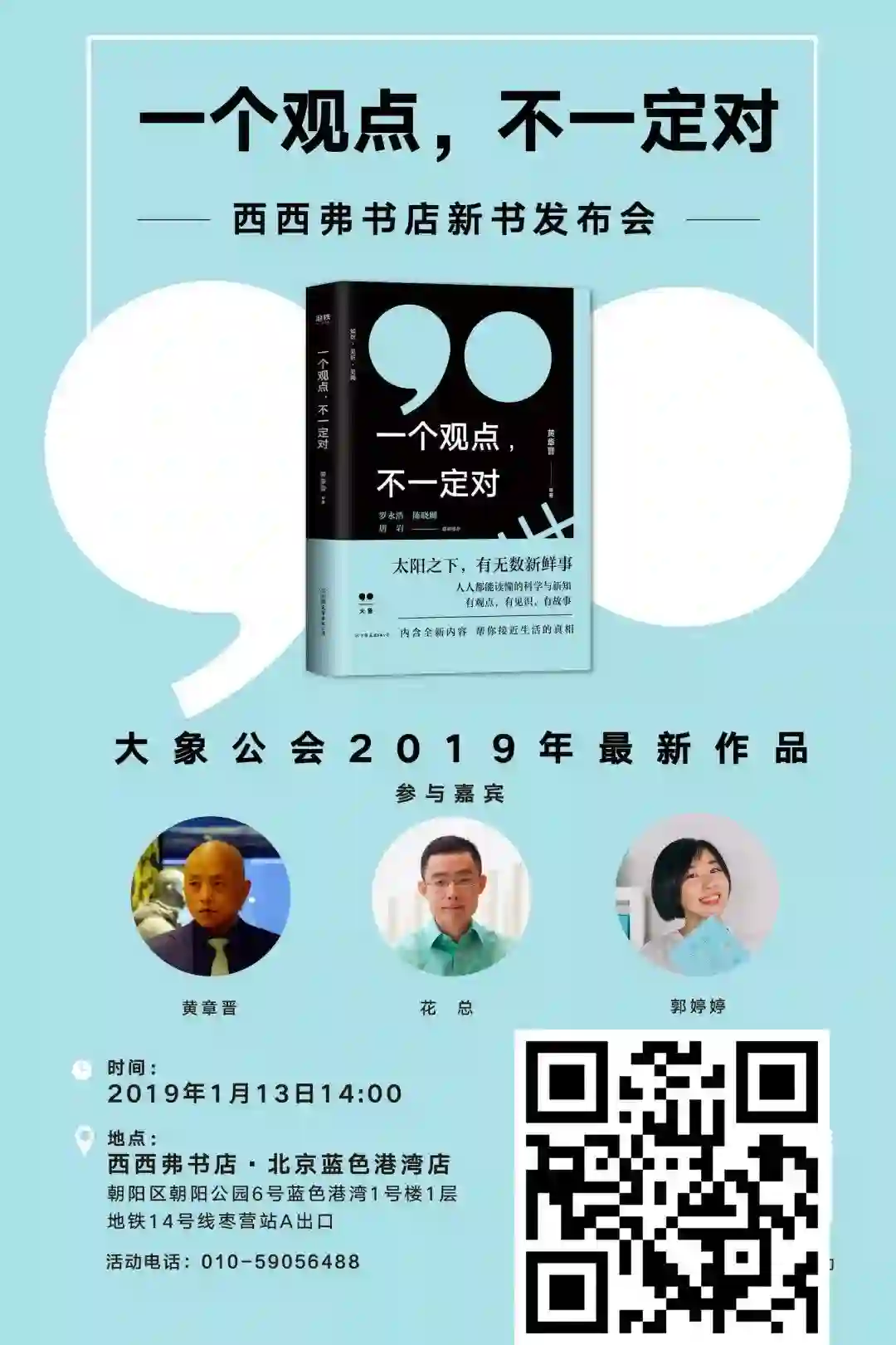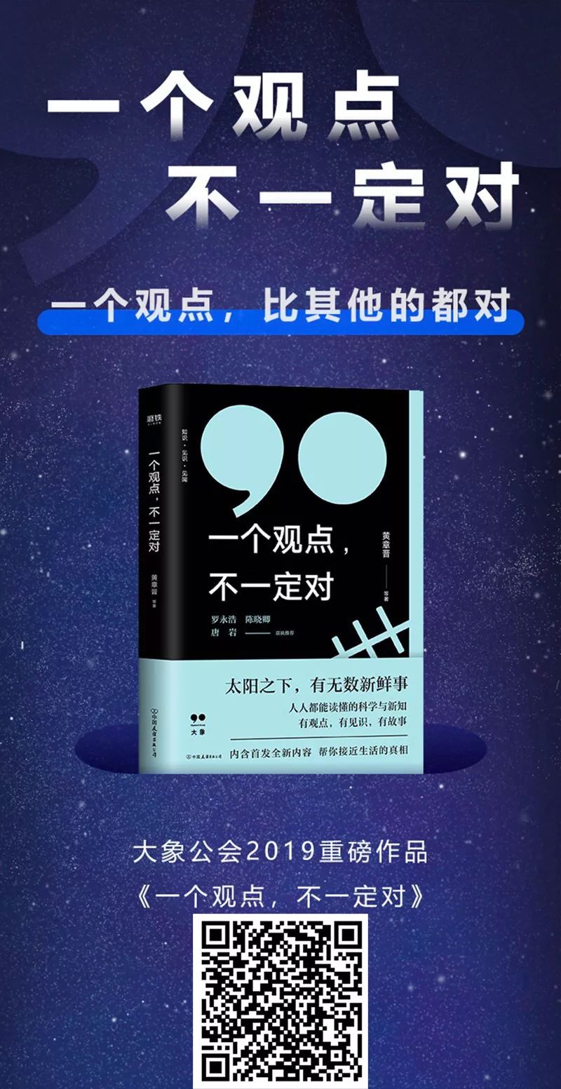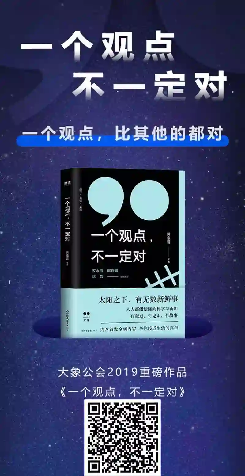 另外,《一个观点,不一定对》新书发布会(北京站)将于2019年1月13日(本周日)14:00在西西弗书店(北京蓝色港湾店)举行,嘉宾包括大象公会创始人黄章晋、著名网友花总、科普写作者郭婷婷,欢迎点击下方二维码报名参加。