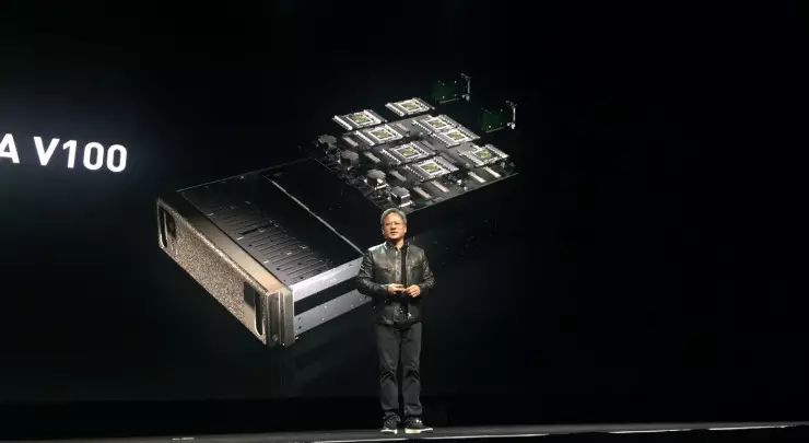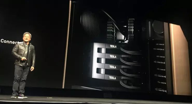 随着GV100 GPU发布,NVIDIA的深度学习超级计算机也进行了升级。老款DGX-1把原有Pascal GPU升级为Volta GPU,名字也更新为DGX-1V。它内置八块 Tesla V100开发板,合计显存128G、运算能力为 960 Tensor TFLOPS,即将迈入下一个时代。黄仁勋表示,过去 Titan X 需花费八天训练的神经网络,用 DGX-1V 只需八个小时。它相当于是“把 400 个服务器装进一个盒子里”。
