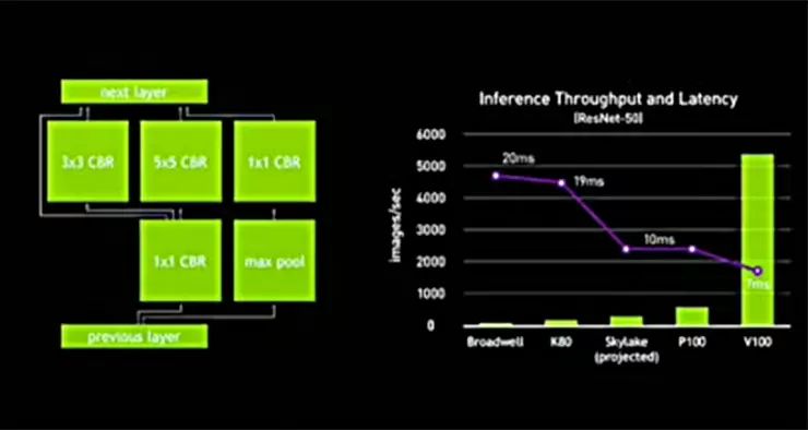 根据现场演讲PPT,推理场景下,V100比上一代搭载GP100 CPU的P100板卡,图像处理能力提升了约10倍,延迟也下降了约30%。在这样的性能提升之下,GPU已经可以让FPGA和ASIC几乎没有用武之地,在商用场景中几乎满足全部计算需求。(详细分析见文末)