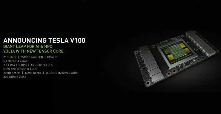 GV100搭载在TESLA V100开发板上亮相,配合来自三星的16GB HBM2显存,显存带宽也达到了900GB/s之高。
