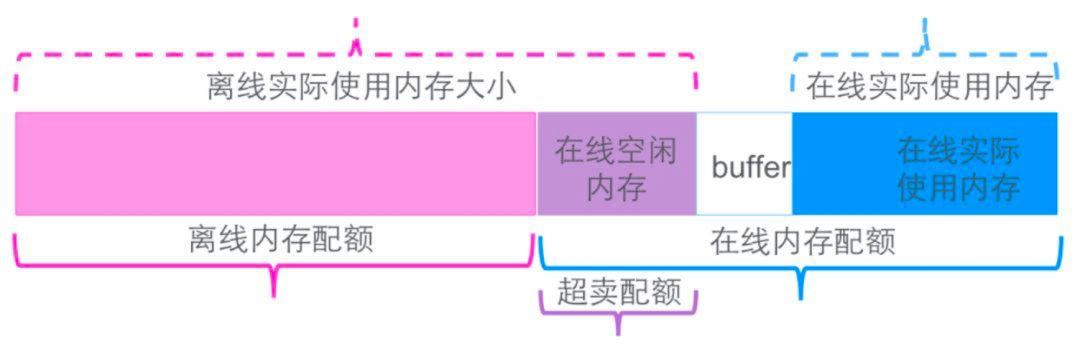 图中可见,离线在使用内存时,多用了分配给在线的内存额度,通过这种机制,实现内存超卖使用。