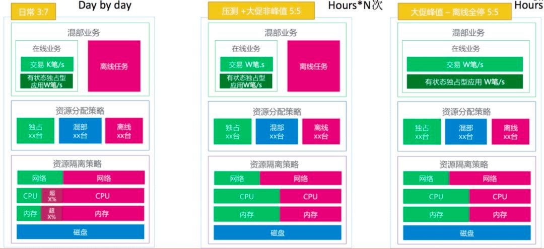 上图资源分布的情况,左、中、右三个矩形框分别代表:日常态、压测态、大促态混部集群的资源分配状况。