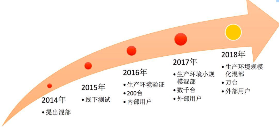 2017年生产环境小规模混部,达到数千台物理机级别,直接面向外部用户,并且支撑了2017年的双十一大促;