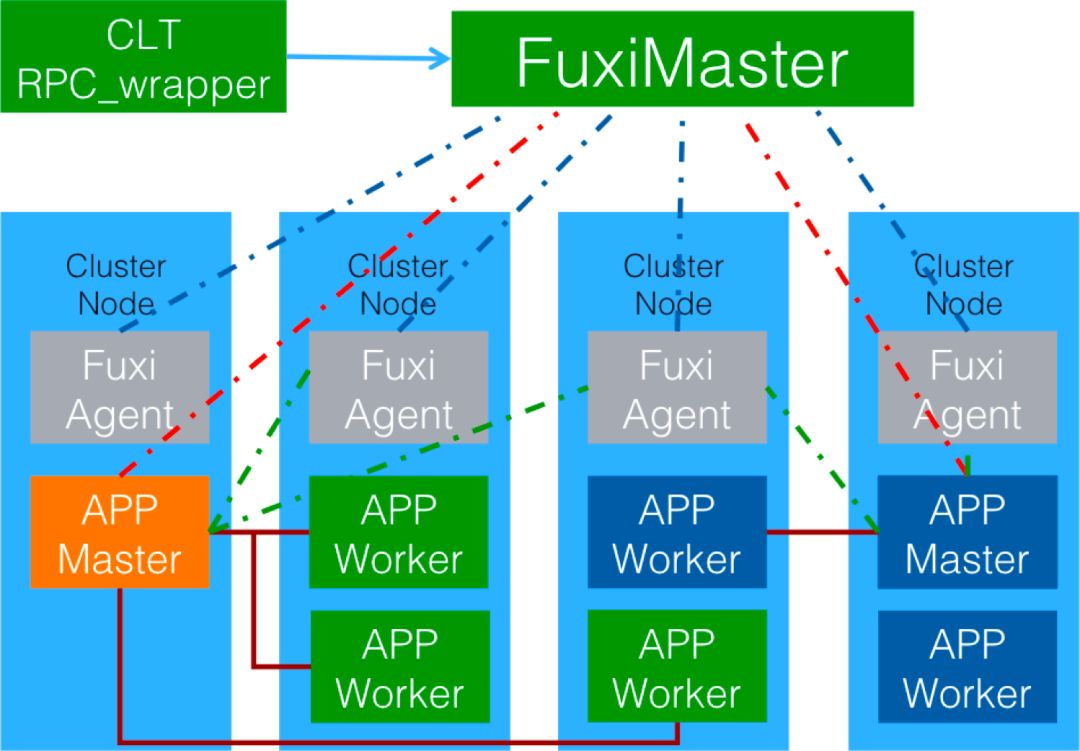 这是离线资源调度Fuxi的运行机制图,其基于Job进行调度,其面向海量数据处理和大规模计算类型的复杂应用,提供了一个数据驱动的多级流水线并行计算框架。