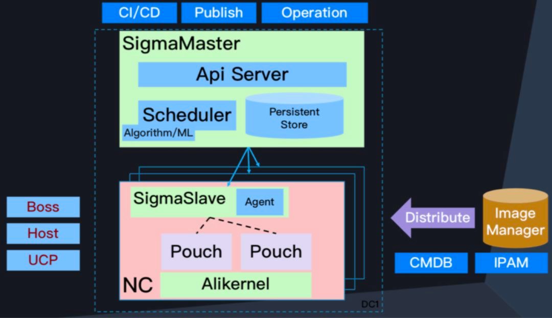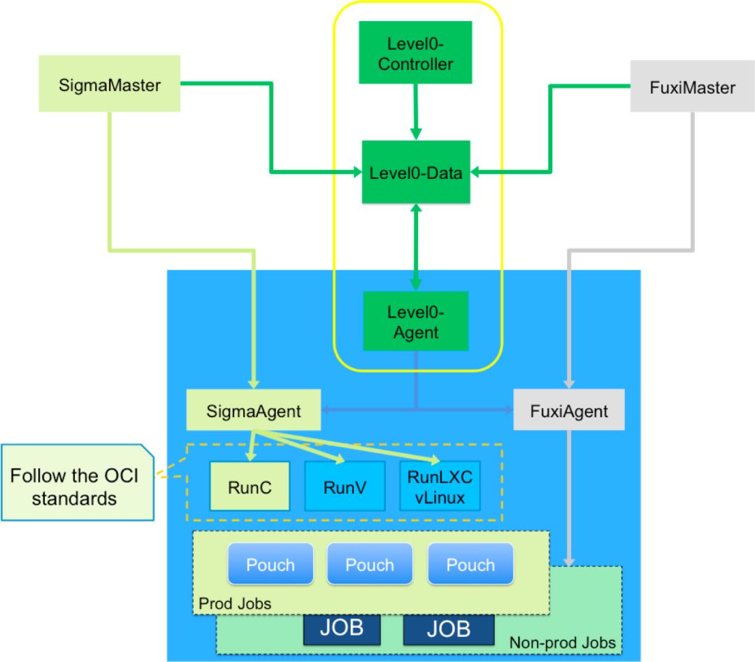 上图是在线一级调度Sigma的架构图,其兼容Kubernetes API,基于阿里Pouch容器技术进行调度,并且进过多年阿里大规模流量及双11大促验证。