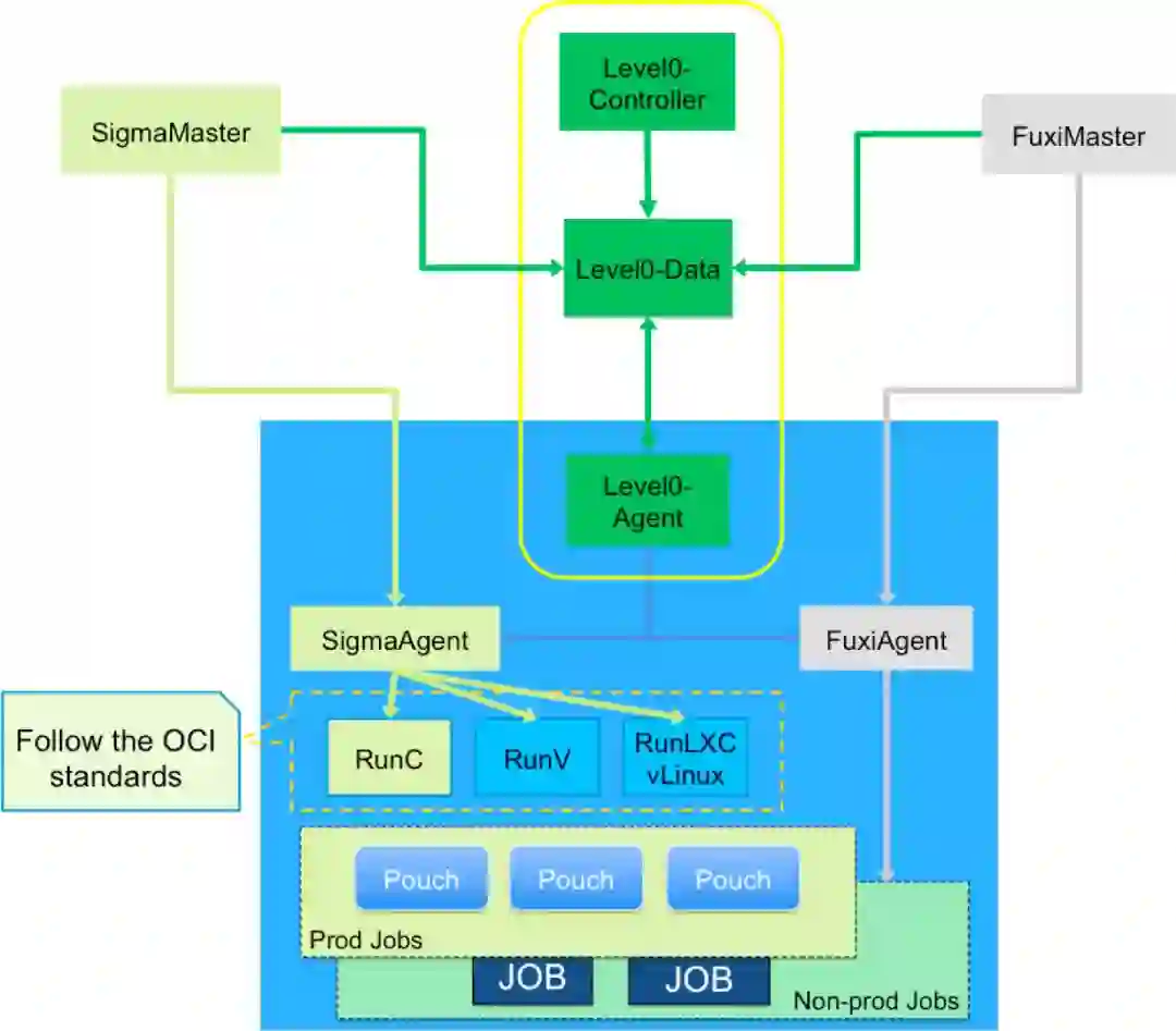 混部技术的第二大核心技术为资源调度技术,混部场景中的资源调度,又可分为原生的一层资源调度(在线资源调度技术sigm和离线资源调度技术Fuxi)和混部0层调度。