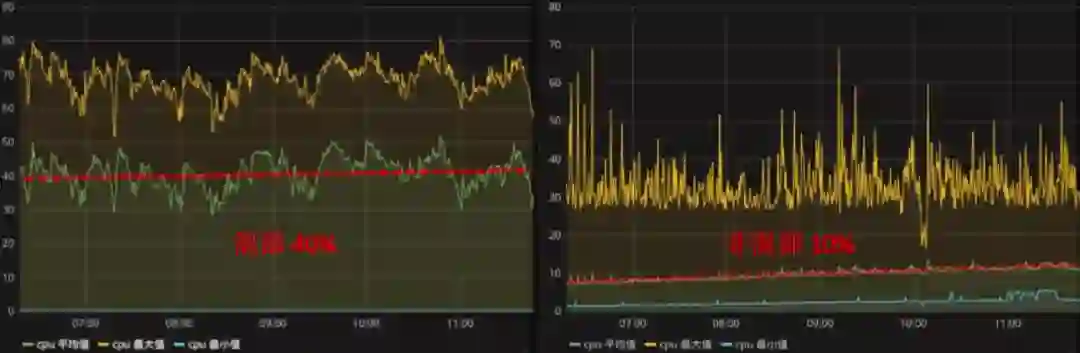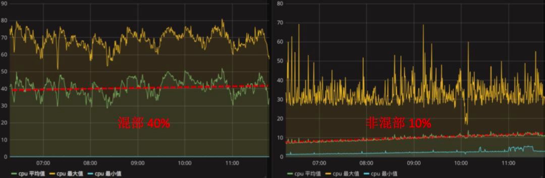 这是真实监控系统的数据。(右图)这个代表非混部场景,时间点大概是7点到11点左右,在线中心利用率是10%。(左图)这个代表混部场景的数据,平均在40%左右,抖动性比较大,因为离线业务本身具有比较大的波动性。