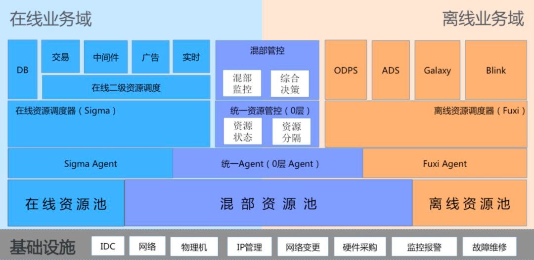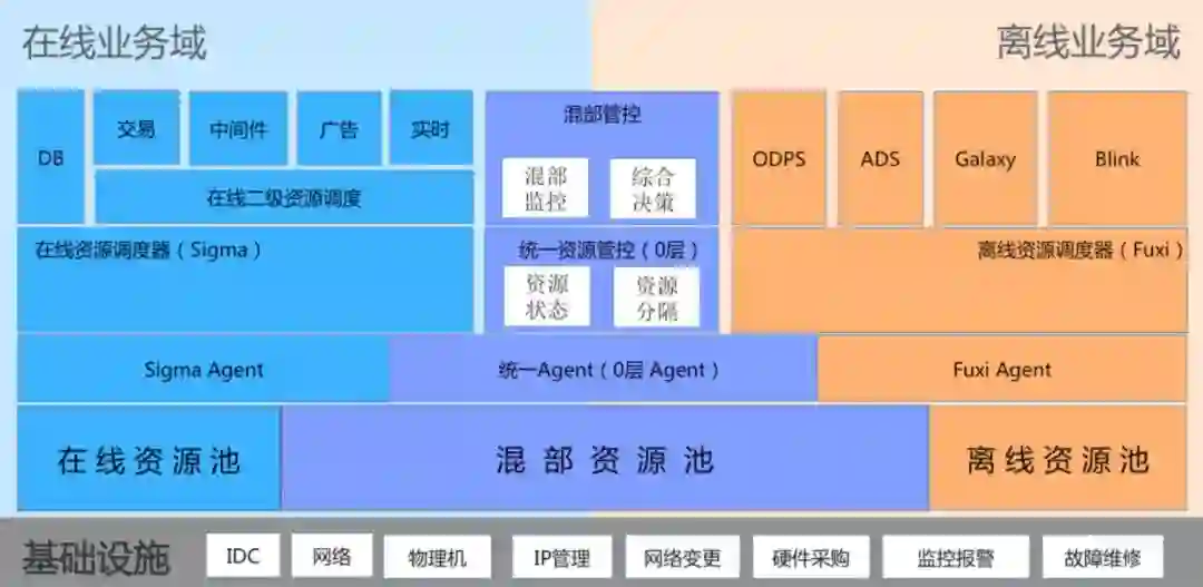 最底层,是基础设施层,整个集团的数据中心是统一的,不管上层怎么用,机器、网络、等等的硬件设施及配套都是同一套;往上一层,是资源层,我们要做混部,必须打通池子,把资源放在一起管控;