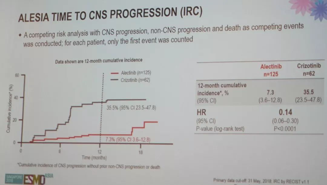 采用竞争性风险分析来评估CNS进展,非CNS进展和死亡作为竞争事件,每例患者仅记录第一次进展事件。结果显示,12个月的累积CNS进展风险,阿来替尼组和克唑替尼组分别为7.3%和35.5%;HR 0.14;95%CI:0.06-0.30;P<0.0001。