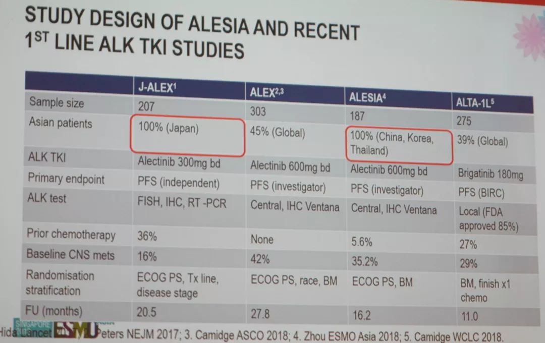 汇总分析近期进行的一线一代 vs 二代ALK TKI头对头对比的研究,J-ALEX研究和ALESIA研究均是在亚裔患者中进行,分别覆盖了日本人群和中国、韩国、泰国人群。在入组人群的基线CNS转移患者比例、分层因素等因素对比上,仍存在一定差异。