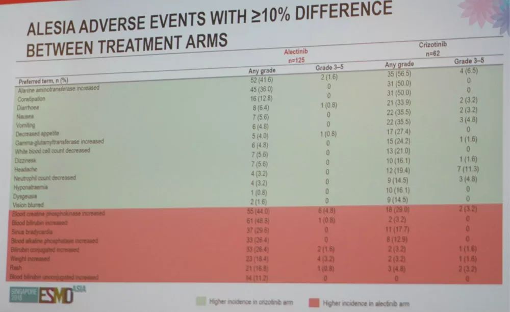 安全性分析:阿来替尼组和克唑替尼组的中位治疗时间分别为14.7和12.6个月;严重AE发生率,两组分别为15.2%和25.8%;3-5级AE发生率,两组分别为28.8%和48.8%;因AE导致治疗终止的患者比例,两组分别为7.2%和9.7%。两组不良事件发生率差别>10%的AE包括转氨酶升高、便秘、腹泻、恶心、呕吐等。