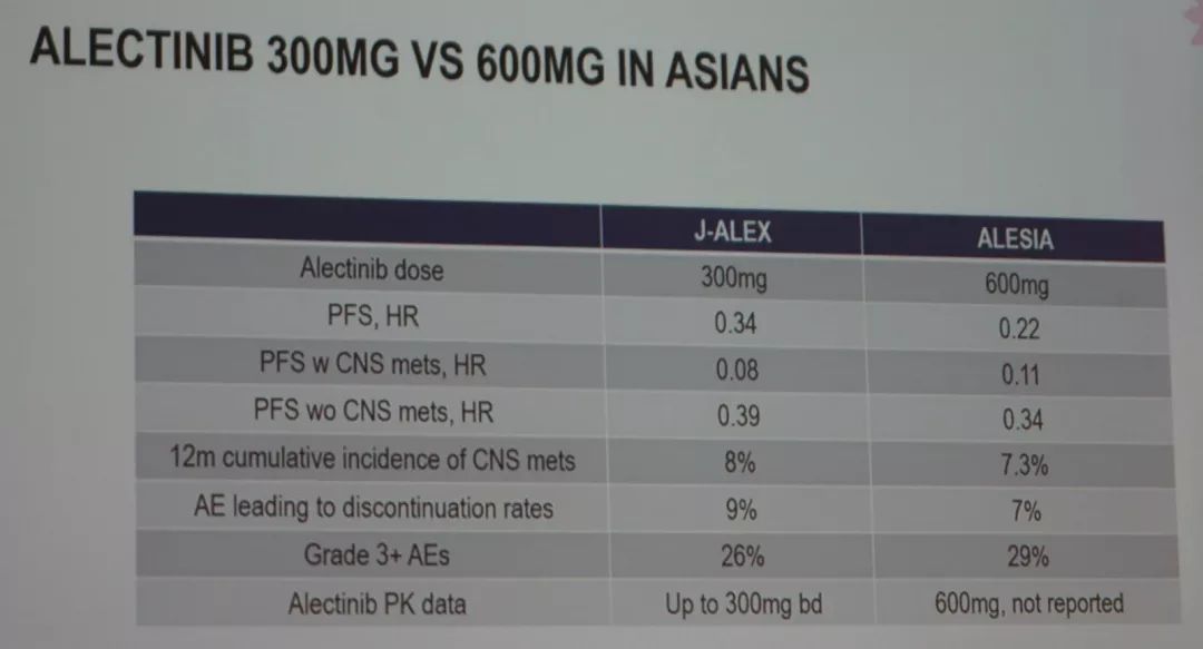 进一步分析阿来替尼的药代动力学,在全球I/II期研究中,不同种族患者接受阿来替尼治疗的PK无显著差异。在亚裔人群中,日本的J-ALEX研究采用阿来替你300mg,bid治疗;而中国为主的ALESIA研究采用阿来替尼600mg,bid治疗,与全球患者一致。横向对比这两个研究的疗效数据,ALESIA研究结果似乎更好,且患者可以很好的耐受,因此,推荐采用阿来替尼600mg,bid治疗模式。
