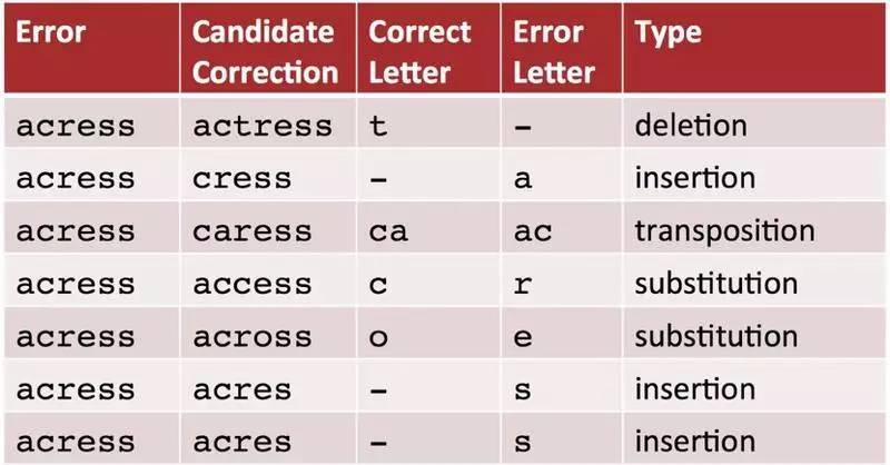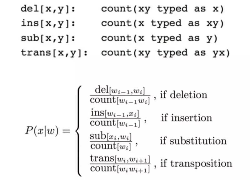 编辑距离包括删除(del)、增加(ins)、替换(sub)和颠倒(trans)四种转移操作,对应四种转移矩阵。这些转移矩阵的概率可以通过对语料库统计大量的正确词和错误词对来得到。