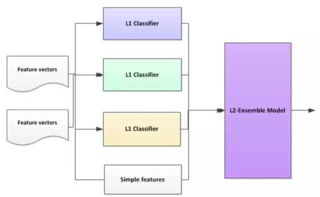 在 Ensemble 框架下,我们分类器分为两个 Level: L1 层和 L2 层。L1 层是基础分类器,L2 层基于 L1 层,将 L1 层的分类结果形成特征向量,再组合一些其他的特征后,形成 L2 层分类器(如 SVM)的输入。这里需要特别留意的是用于 L2 层的训练的样本必须没有在训练 L1 层时使用过。