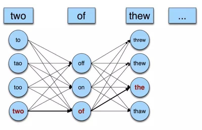 噪声信道模型和 Non-word 纠错类似,只是计算目标从某个候选词的最大概率变成不同位置候选词组合形成的句子 p(s) 的最大概率,这个问题可以使用 HMM(Hidden Markov model,隐马尔可夫模型)求解。