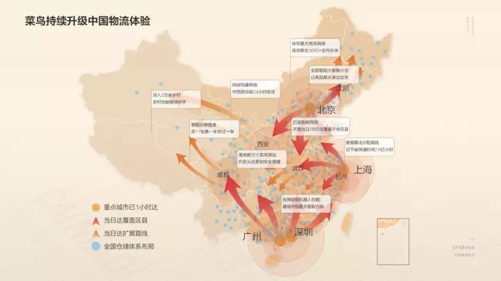 京东物流如今最具优势的当日达、次日达实力,也是在马云的规划之中的。四年前,马云曾提出一个愿景:未来全国快递24小时送达,全球72小时送达。这也是他成立菜鸟的原因。