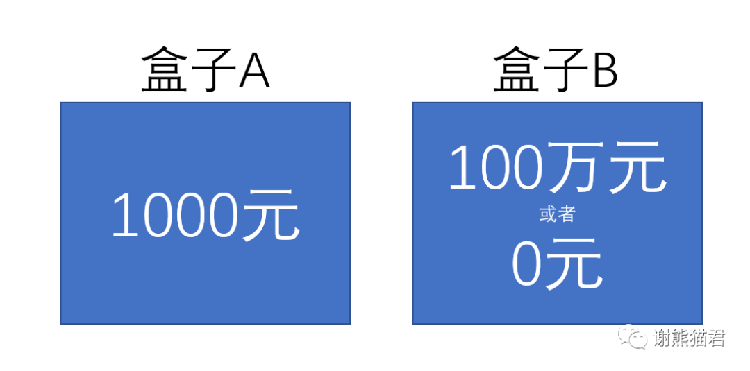 其中盒子A里面肯定有1000元,盒子B里面可能有100万元,也可能是空的。