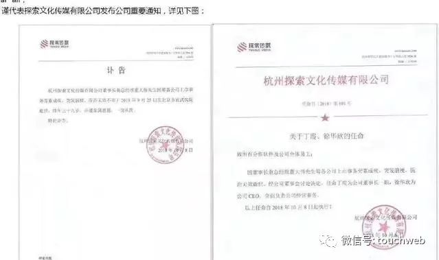 杭州探索文化传媒有限公司董事长兼总经理董大伟过世。探索传媒发布的讣告:董大伟是因筹备公司上市事务劳累成疾,突发脑梗,医治无效逝世,终年39岁。探索传媒已任命丁霞为公司董事长一职,徐华欣为公司CEO,全面负责公司经营事务。