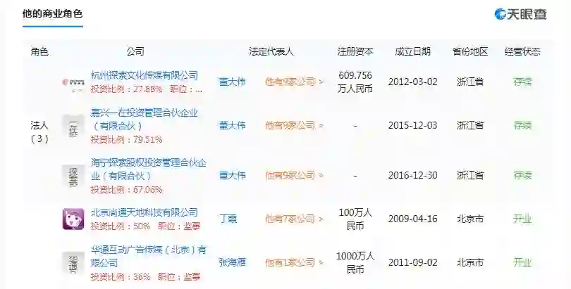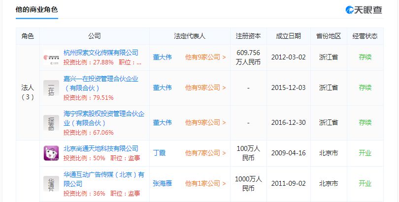 早在3年前,董大伟就已是几家公司的法人,而且,他还在2年之内,投资了7家公司,其中有4家正在或已经完成上市。
