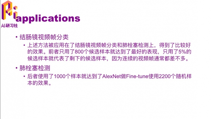 这个方法在机器学习方面是比较通用的,就是找那些难分的数据去做sequntial的fine-tune。这篇论文里主要是用在了医学图像上面,用两个例子实验了结果,一个是结肠镜的视频帧分类,看看有没有病变、瘤之类的。结论是只用了5%的样本就达到了最好的效果,因为其实因为是连续的视频帧,通常都是差不多的,前后的帧都是类似的,不需要每一帧都去标注。另一个例子也是类似的,肺栓塞检测,检测+分类的问题,只用1000个样本就可以做到用2200个随机样本一样的效果。