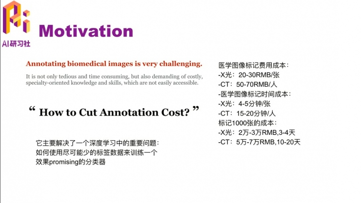 其实在机器学习,特别是深度学习方面,有一个很重要的前提是需要有足够量的标注数据。但是这种标注数据一般是需要人工去标注,有时候标注的成本还是挺高的,特别是在医学图像处理上面。因为医学图像处理需要一些 domain knowledge,就是说医生对这些病比较熟悉他才能标,我们一般人是很难标的。不像在自然图像上面,比如ImageNet上面的图片,就是一些人脸、场景还有实物,我们每个人都可以去标,这种成本低一点。医学图像的成本就会比较高,比如我右边举的例子,医学图像常见的两种方式就是X光和CT。X光其实一个人一般拍出来一张,标注成本大概在20到30块钱人民币一张;CT是横断面,拍完一个人大概有几百张图片,标注完的成本就会高一点,标注的时间也会比较长。