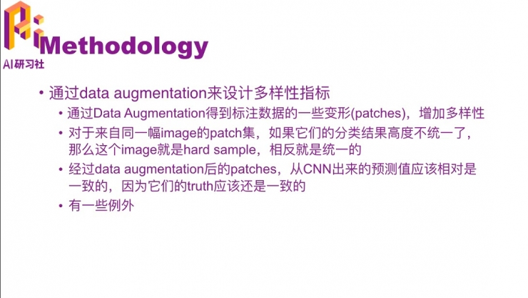 刚才提到了两个指标来判定一个数据是不是难分的数据。entropy比较直观,预测结果在0.5左右就认为它是比较难分的;但diversity这个值不是很好刻画,就通过 data augmentation数据增强的方式来设计指标,就是说从一个图像设计出一系列它的变形。这些变形就可以是靠翻转、旋转、平移操作等等,一个变成了好几个甚至十几个,增加了它的多样性。然后对这些所有的变形去预测它们的分类结果,如果结果不统一的话,就说明这副图像的diversity比较强,那么这张图像就是比较难分的,是hard sample;反之就是比较好分的,那么就不去做它的增强了。然后对所有增强以后的数据的预测值应当是一致的,因为它们代表的是同一个东西,但是也有一些例外,如果是像我刚才说的那样的简单的数据增强。