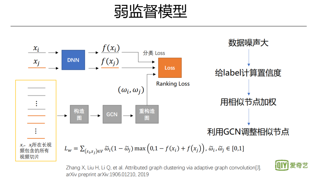 接下来我们再看一下,弱监督模型这一块。我们有很多用户观影行为数据,是否可用于拟合对分数的标注。比如观看行为,观看次数越高,一般也越精彩。但是不同视频本身热度不一样,同一个视频的不同部分,单纯看播放量也不公平,因为很多用户不会看完整个视频,一般前面的片段播放量会更高。所以,直接将用户行为作为精彩度的度量,虽然相对于人工标注的分数更能体现用户的实际偏好,但还是存在非常多的噪声。为了减少噪声影响,要做很多数据预处理,比如尽量避免用区分度不大的数据。除了关心绝对精彩度,也关心相对大小,即一个视频中,哪些内容相对其余部分更有吸引力。我们往往会从一个视频当中,筛选相对精彩的内容,去做二次创作、投放广告等。在这样的诉求下,可以采用Ranking思想去设计Loss。因为噪声较大,会给label计算置信度,比如可以用相似的样本来做平滑。这里我们还可以利用图,设计图卷积过滤高频信息更新样本feature,实现更好的聚类,并利用更新后的相近节点来修改样本置信度,最终有效提升弱监督模型效果。