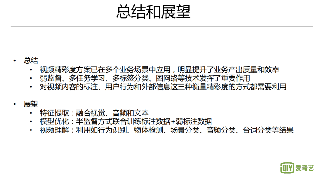 后续的展望,第一方面是在特征提取上,尽量去融合更多的信息,包括文本的信息,比如台词、弹幕等。第二个是在模型上,比如怎么通过半监督的方式,把有标注和无标注的数据,放到一个统一框架中来。第三点是如何利用各种垂直识别,不管是底层的识别,还是偏上层的推理形成高层语义,需要能把这些信息利用起来,从而知道为什么精彩,作出可解释的精彩度评价。