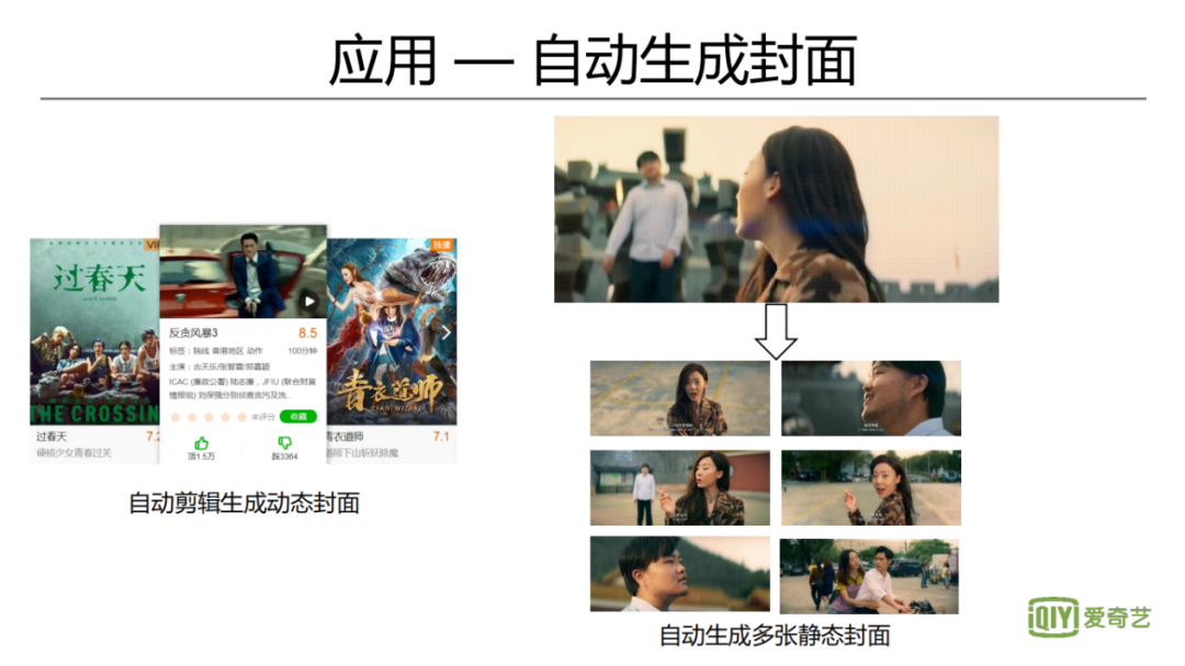 智能封面图生成,目前线上的影视剧封面,采用自动生成动态图的方式。对视频中精彩片段进行打分,并需要保证片段的多样性和代表性。对于图片也会有精彩度、美学等分析。不管是静态封面图还是动态封面图,都可以生成多个,然后去做个性化的分发,并通过线上的反馈来调整生成封面图的策略。