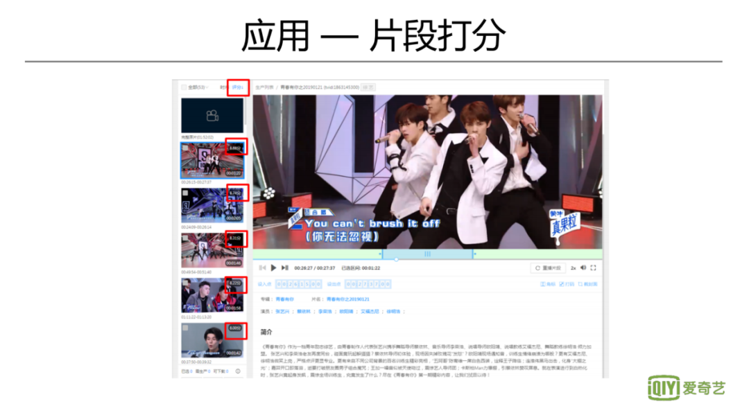 还有一个应用,是直接对片段的精彩度打分,有利于冷启动阶段的分发;也能给创作者提供参考。
