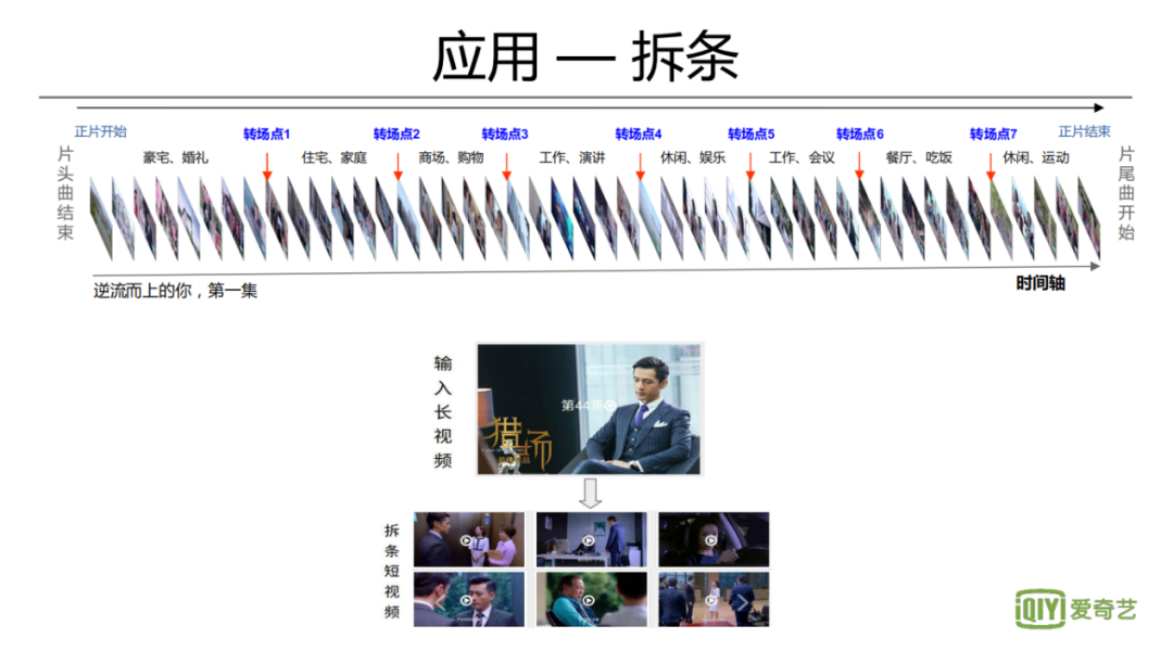 第二个应用是长视频拆条。做一个比较好的拆条,要从长视频当中选出比较精彩的部分,同时满足切分方式的合理性。可以方便投放在站内或者是站外的各种渠道上,这样可利用用户的碎片化时间,一方面形成对短内容的消费,一方面也能够起到短带长的作用。所以要做拆条的话,不仅仅需要对内容本身的理解,也需要对精彩度做分析。