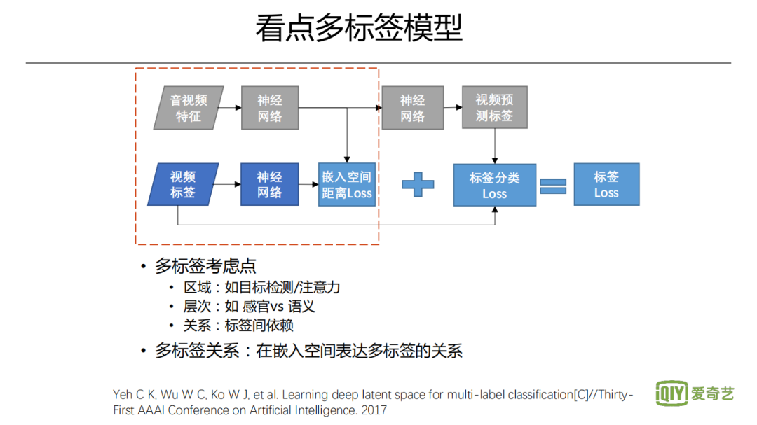 接下来看第二点,关于视频内容的看点多标签。比如像打斗、爆炸,都是比较有意思的标签,可能是会吸引人的。对于不同类型的视频,看点的标签是不一样的。比如说对于偶像片来说,浪漫的标签可能非常有吸引力;对于动作片来说,可能飙车、打斗、枪战等很有吸引力。多标签模型,在近几年各领域都广泛关注,包括短视频标签、图片多标签、文本多标签等。多标签的难点,是如何对同样的信息去生成不同的标签,针对这个问题会有三个方案。第一种是利用信息不同区域对应不同的标签,可以类比目标检测。即划分图像的不同区域,用其本身及周边的信息,去预测该区域的一个标签。那第二个是层次的关系,比如从画面视觉内容来说,一男一女在西餐厅吃烛光晚餐,则需要进行性别识别、场景识别、目标检测等,同时它是一个浪漫的约会场景,所以还可以推理出上层的标签。第三个要考虑的点,是标签之间的依赖关系,有一些标签很可能经常共同出现,比如说有海滩和阳光。有一些标签之间不太容易共现,比如手机跟古装片,可能是互斥关系。当然如果能识别这是一个穿越片,就可认为这两个标签共现是比较和谐的。在很多看点多标签之间,有这种互相依赖的关系,如何去表达标签的关系有很多方式,比如说CNN和RNN结合,通过RNN去显示地表达标签之间的依赖。那其它一些方式,比如通过标签embedding,希望其去影响分类器,而对于这个embedding,可能会通过图的拓扑结构,根据相似的邻域标签信息来修改embedding,从而让这个embedding包含标签之间的关系,再将这个embedding以某种方式去影响分类器。还有一种方式,就是训练时找到一个嵌入的空间,把ground truth的多标签投射到嵌入空间,利用多标签去生成一个feature,同时对于待处理的数据也生成一个feature,要求这两个feature要尽可能接近,之间的某种距离可以作为loss之一。这样,嵌入空间的音视频feature,即表达了多标签的关系,可以认为是对多标签的编码,而后续的分类过程,就是对多标签的解码。