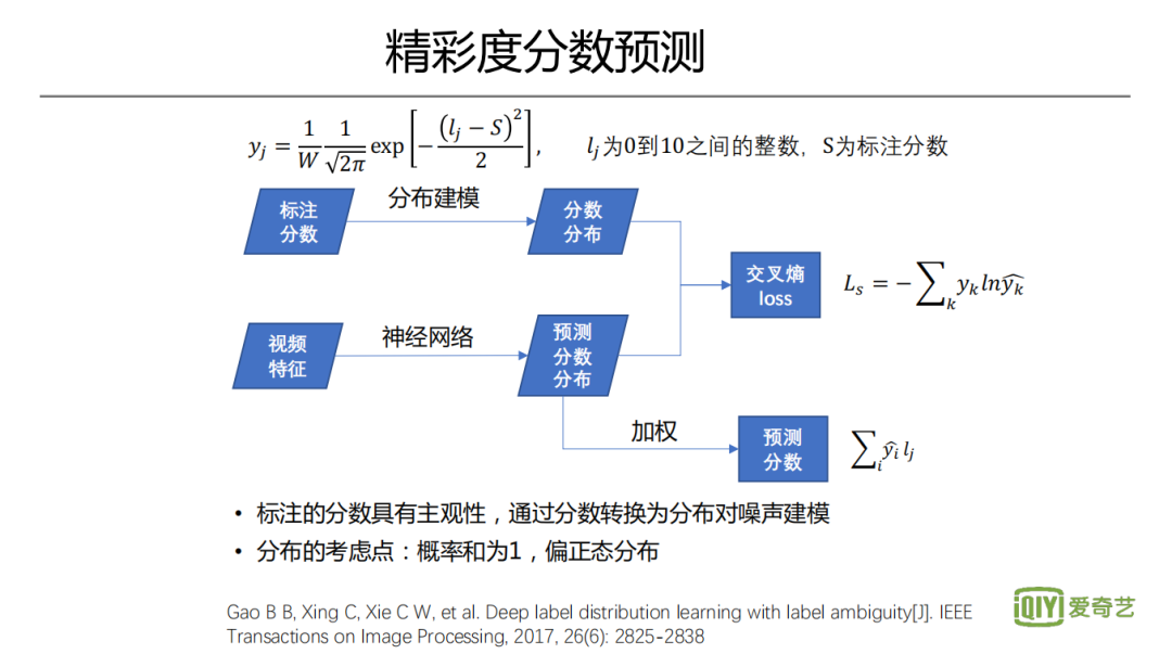 监督模型的一个分支是精彩度分数预测。对于精彩度分数,会先做人工标注,但是因为主观性偏向非常强,所以噪声较大,可信度并不高。当标注为某一个分数,那它很大概率会是以这个分数为均值的正态或偏正态分布。比如标注分数是六分,那该视频可能很大的概率是六分,但也可能会小一些的概率是五分或七分。为减少噪声影响,会对噪声做一个建模,直观的假设,将标注的分数看做一个正态分布的均值。为了满足概率积分的要求,实际上设计了一个偏正态分布。分布的方差通过理论分析+实验,来确定一个比较合适的值。有了这个分布,对于分数的回归,可以变成一个类似分类的任务,对于每一个离散值给出一个概率,这样得到对分布的预测,从而加权得到最终预测的分数。采取该策略后,我们发现对于噪声比较大的主观性标注任务还是有意义的,其它一些图片回归任务我们也用了类似方法,取得了不错的效果。