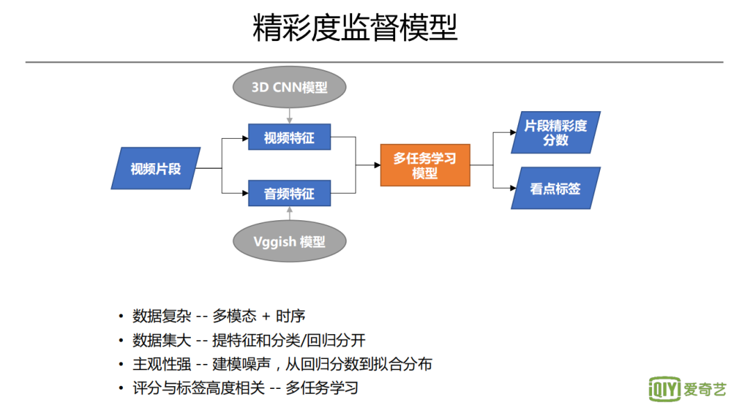 对于精彩度的监督模型,首先需要标注人员对视频精彩度进行打分。考虑到数据的复杂性,会充分利用多模态和时序关系去提取信息。操作中会有一些具体技巧,比如由于其标注主观性比较强,会进行噪声建模,从回归分数变成一个拟合分布。另外,评分和标签是高度相关性的,因此可以通过多模型、多任务学习的方式来进行。