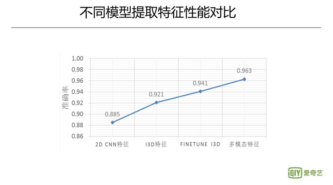 这张图显示了采用不同的模型提取特征,对最终精彩度输出的影响。最初的方法是针对图片信息采取2D的CNN,再去对帧级别feature进行融合;接着考虑由时序上的3D卷积模型来提特征;然后尝试根据预训练模型来进行微调;再利用视觉+音频的多模态的信息进一步提升。