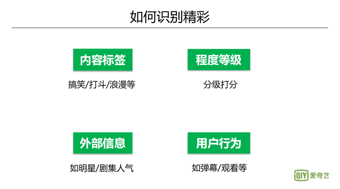 这就促使我们去思考,如何分析内容的精彩度,这里有几个维度:第一,内容标签,比如打斗等偏感官层面的信息或者是浪漫等偏高层语义方面的信息,这需要理解视频内容。第二方面是程度等级,比如说打斗,如果是武林高手之间的对决,相比于我们普通人之间打斗会更精彩,所以需要一个分级打分机制。还有一些信息影响到用户对视频的喜好,比如对明星、IP、剧集等的喜爱,都会影响用户对其精彩度的判断。前面这3点是人们对于视频精彩度的一个理性分析,但实际上精彩度还是较主观的看法,同一个视频,有些人觉得精彩,有些人则不觉得。一些上映之后成为收视率“黑马”的作品,在上映之前,人们没有预期到其足够精彩,上线之后,却成为爆款,这体现了对精彩度主观判断的局限性,因此我们也要考虑视频上线后的用户反馈。比如用户的播放、弹幕等行为,有些视频片段用户会反复播放,另一些则会被跳过。我们希望通过以上几个方面,构建对于精彩度的认知。