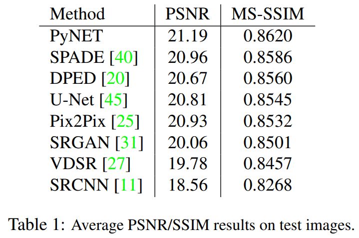 研究者针对 PyNET 和其他深度学习方法进行了定量评估,其 PSNR(峰值信噪比)和 MS-SSIM 结果如上。可以看出 PyNET 在两项指标上都高于其他深度学习模型。