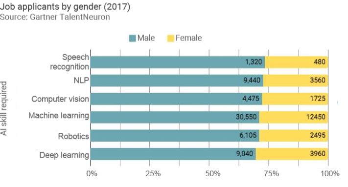 人工智能相关岗位的性别差距依然严重。上图的显示按照技能分类,各个技能之间有相关性。申请人的数目并不代表雇佣人数,但总体而言,在美国,男性占人工智能相关职位申请申请人数的71%。在人工智能各个子学科之间,深度学习和机器人学对比其他学科,性别比例相对平衡。
