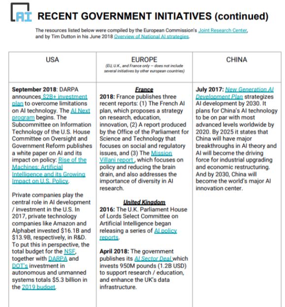 在欧盟地区,法国最近发表了三份报告:(1)法国Al计划,其中提出了一项关于AI研究、教育、创新的战略;(2)编写了一份侧重于社会和监管问题的报告;(3)《 Mission Villani report》,该报告侧重于政策和减少人才外流,并阐述了多样性在AI研究中的重要性。英国从2016年开始发布一系列的