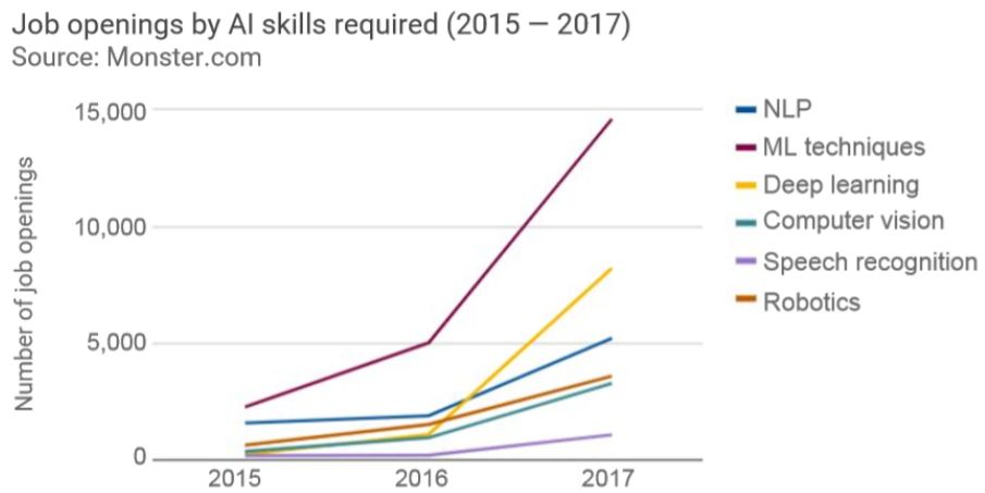 虽然机器学习是最重要的技能,但深度学习(DL)正在以最快的速度增长,2015年到2017年这一时间段,深度学习的职位空缺数量增加了35倍。