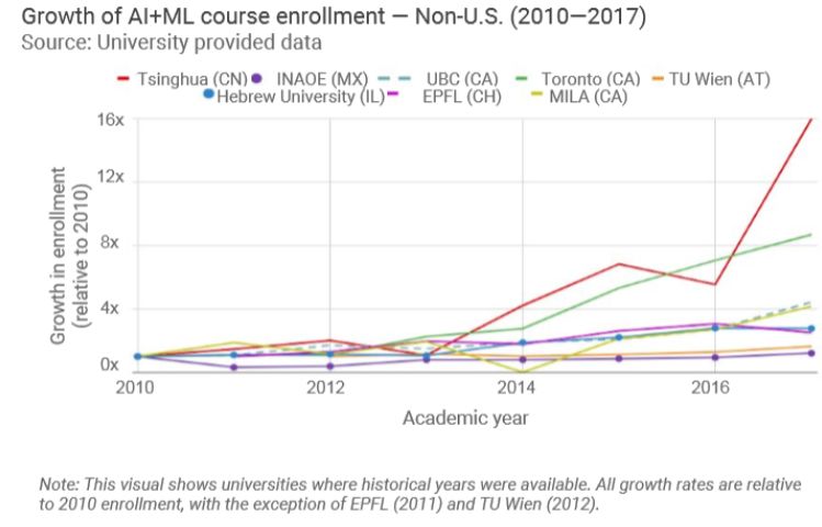 作为中国的人工智能最强高校,清华大学也在这一报告中多次被提到:大学人工智能和机器学习相关课程注册率在全球范围都有大幅提升,最引人注目的是清华大学相关课程的增长率,从2017年的注册率比2010年高出16倍,比2016年高出了将近3倍。