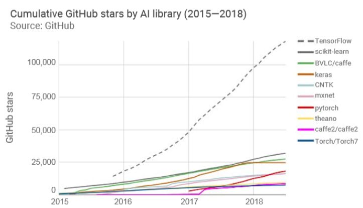 上图显示了各种Al和ML软件包在GitHub上的受欢迎比率,从获星标数量可以大致哪种AI框架最受欢迎。从2015年到2018年,Tensoflow一直占据第一,scikit-learn一直占据着第二的位置。