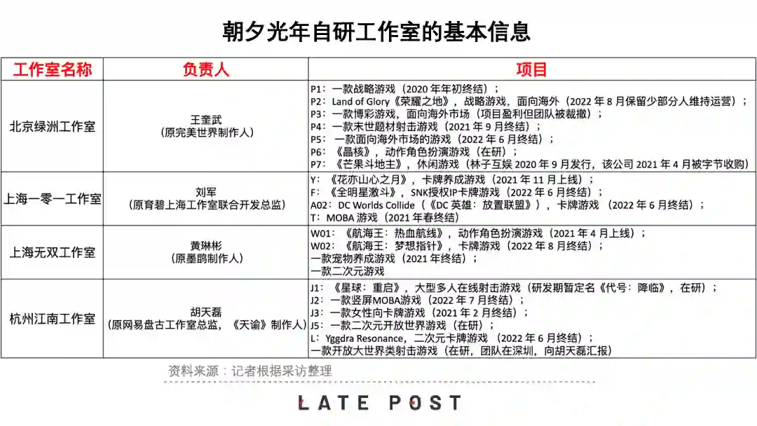 与此同期,网易裁撤杭州的盘古工作室。盘古工作室原总监胡天磊及十几位管理层加入朝夕光年,组建杭州江南工作室。多位业内人士评价江南工作室的研发能力是朝夕光年中最好的。2020 年,江南工作室立项 3 个,其中 2 个项目的制作人在前公司只担任过游戏策划,没有管理过完整项目。