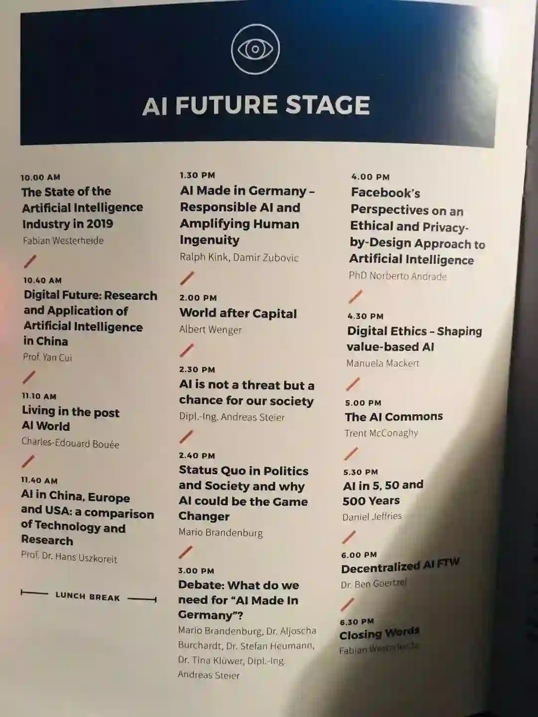 当 AI 科技评论记者看见 Future Stage 的议程中竟然包含类似《AI MADE IN GERMANY - RESPONSIBLE AI AND AMPLIFYING HUMAN INGENUITY》、《DEBATE: WHAT DO WE NEED FOR "AI MADE IN GERMANY"?》这样试图为德国 AI「正名」的演讲主题,感到非常惊奇。特别是后者的辩论环节(其实像个圆桌),直接把德国国会议员和人工智能委员会成员请到了讲台上「华山论剑」。