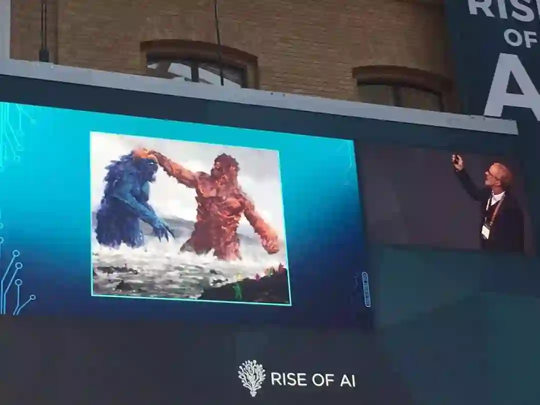 HANS USZKOREIT 博士笑着说,大家应该能猜到两头怪物分别代表的是哪两个国家,在这场 AI 战役中,欧洲在哪?岸边的绿色小人?
