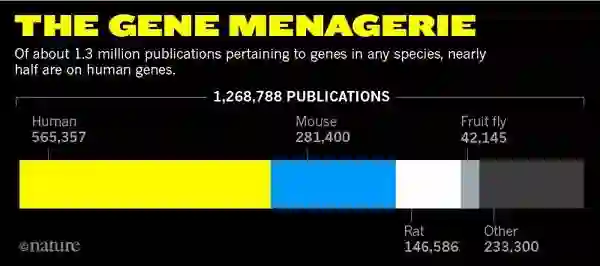 除了人类,NLM还追踪了其他几十个物种的基因研究,包括小鼠、果蝇、病毒等。结果显示,过去50年研究最多的100个基因中,超2/3是人类基因。