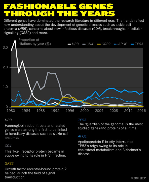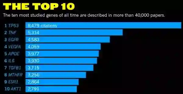 位列榜单之首的是TP53基因。3年前,当Peter Kerpedjiev正式开始这一统计研究时,关于TP53及其编码蛋白p53的研究论文就有6600篇。现在,这个数字达到8500篇。平均而言,每天会有两篇描述TP53基本生物学新细节的文章发表。