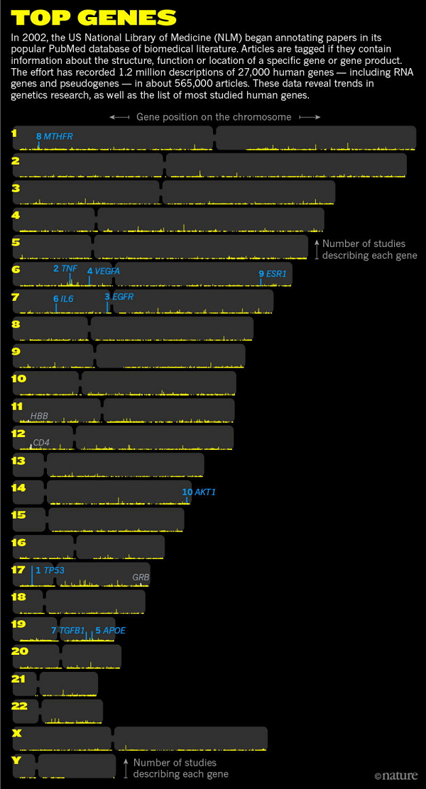 从2002年开始,美国国立医学图书馆(NLM)启动了一项工作:对PubMed数据库中涉及基因(或其编码蛋白)的结构、功能研究的文章进行标记,共统计了解析27000人类基因(包括RNA基因和假基因)的565000篇文献。